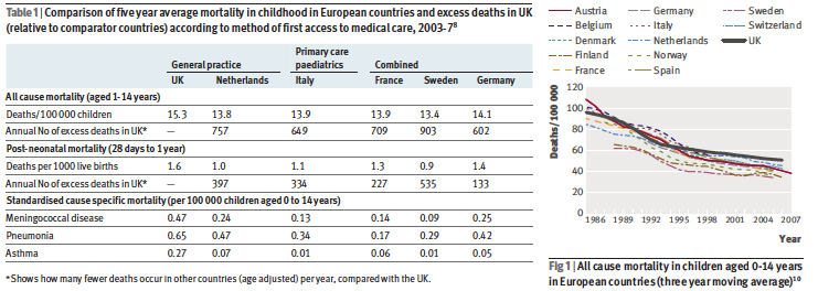 Death rates from illnesses that rely heavily on first access services—for example, meningococcal disease, pneumonia, and asthma, are higher in the UK than in Sweden, France, Italy, G ermany, and the Netherlands (table1). 8 Survival rates are lower in the UK for some childhood cancers. 9 These contribute to the UK’s higher all cause childhood mortality compared with other European countries (fig 1). Although the incidence of many diseases is affected by socioeconomic conditions, deaths from the diseases cited here should be preventable by healthcare. If the UK health system performed as well as that of Sweden, the best performing country in our sample, as many as 1500 children might not die each year (table 1 and bmj.com).