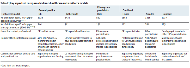 All five countries examined in table 2 have substantially more doctors looking after children (per capita) than the UK, 10 22 23 but there are also important organisational differences.