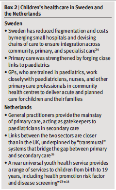 Our analysis suggests there are two broad areas to consider in improving UK care: the children’s healthcare team and the wider system. A better balance is needed between accessibility and expertise for first access and planned care for children. Sweden’s model of co-locating general practitioners and paediatricians in health centres may be feasible in the UK. This cooperative model would protect the traditional NHS values of family medicine but also improve first access care and community based coordinated multidisciplinary services for children with long term conditions.